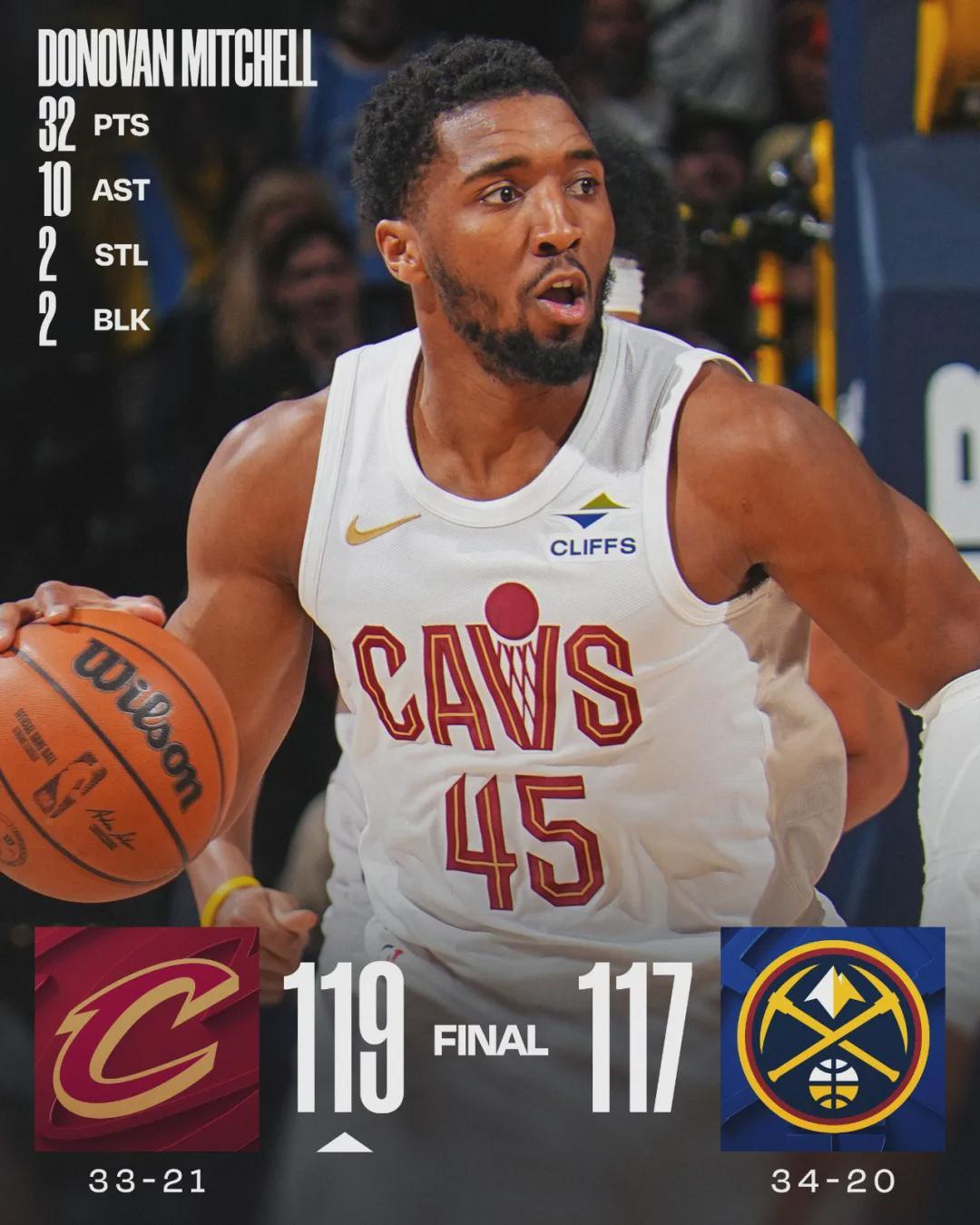 騎士三人砍下20+10:米切爾23投11中,三分10中3,罰球8中7,砍下32分10助攻2搶斷2蓋帽,正負值+3。米切爾賽后說道:“我們的新陣容還沒有真正合練過,就是憑感覺打球?!辟Z萊特-阿倫16投10中,得到22分13籃板1助攻。