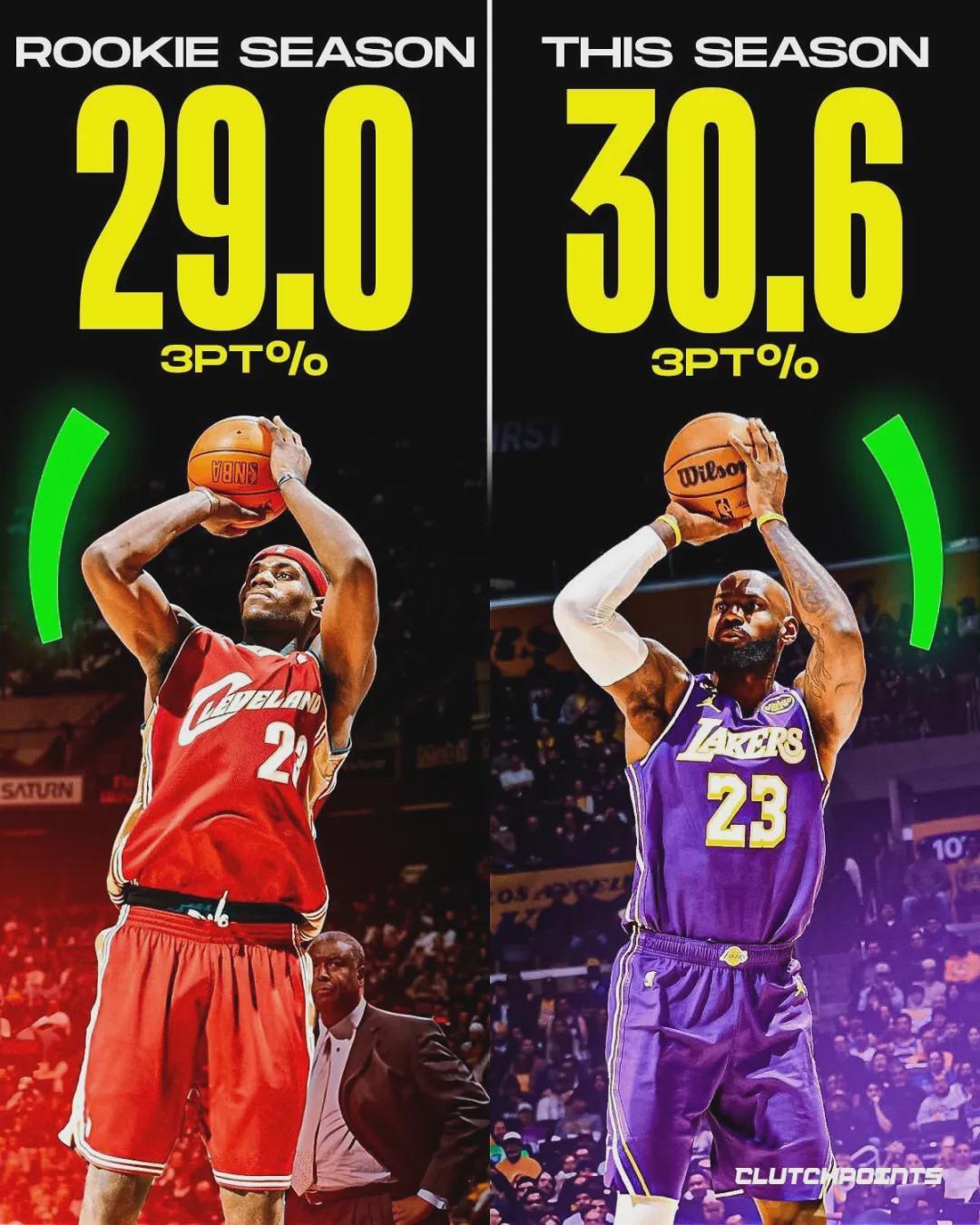 詹姆斯連續(xù)21年入選全明星首發(fā)的紀(jì)錄,上個(gè)月也被終結(jié)了,不過(guò)他后來(lái)以全明星替補(bǔ)的身份入選。詹姆斯本賽季三分命中率30.6%,職業(yè)生涯第二低,僅高于新秀賽季的29%。本賽季詹姆斯打了35場(chǎng)比賽,三分球合計(jì)160投49中。