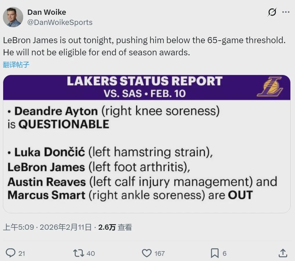 北京時(shí)間2月11日上午11點(diǎn)半,湖人背靠背主場(chǎng)迎戰(zhàn)馬刺。賽前湖人官方宣布,四名球員因傷休戰(zhàn):詹姆斯(左腳)、東契奇(左腿筋拉傷)、里夫斯(左小腿)、斯瑪特(右腳踝酸痛)。這是詹姆斯本賽季缺席的第18場(chǎng)比賽!