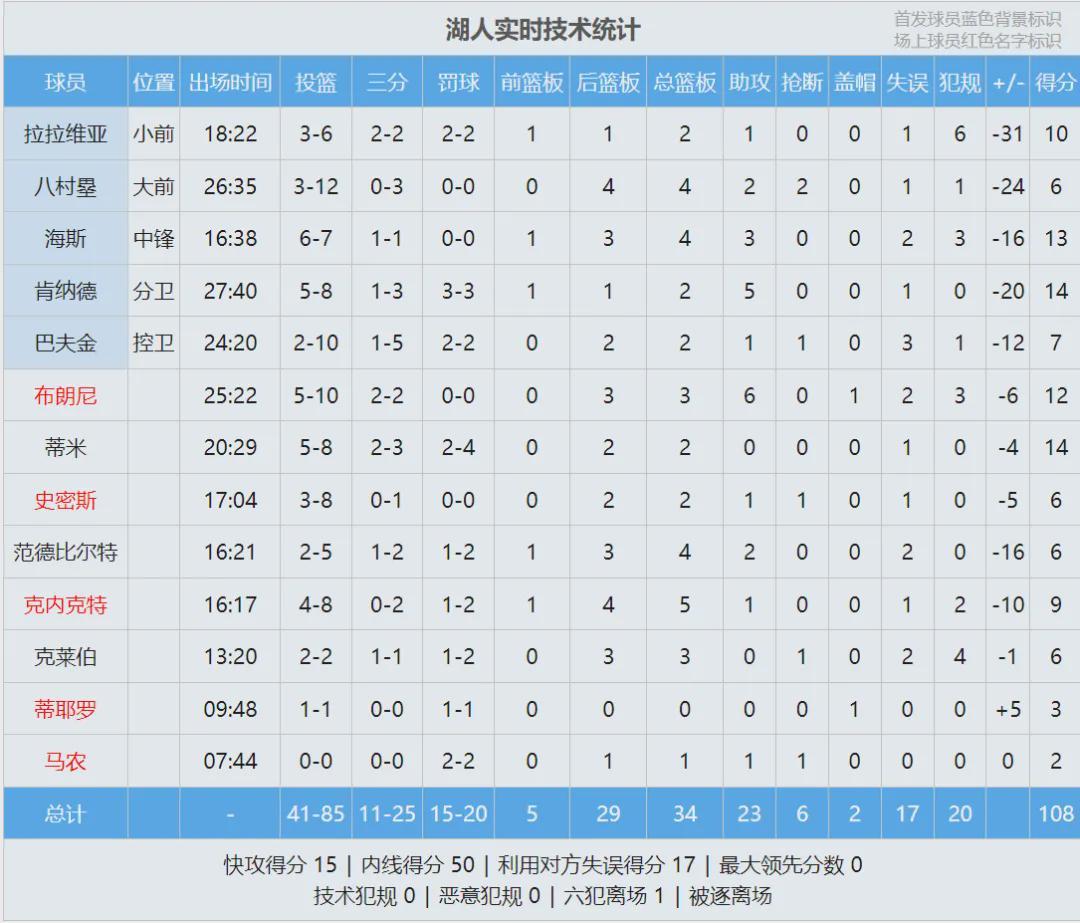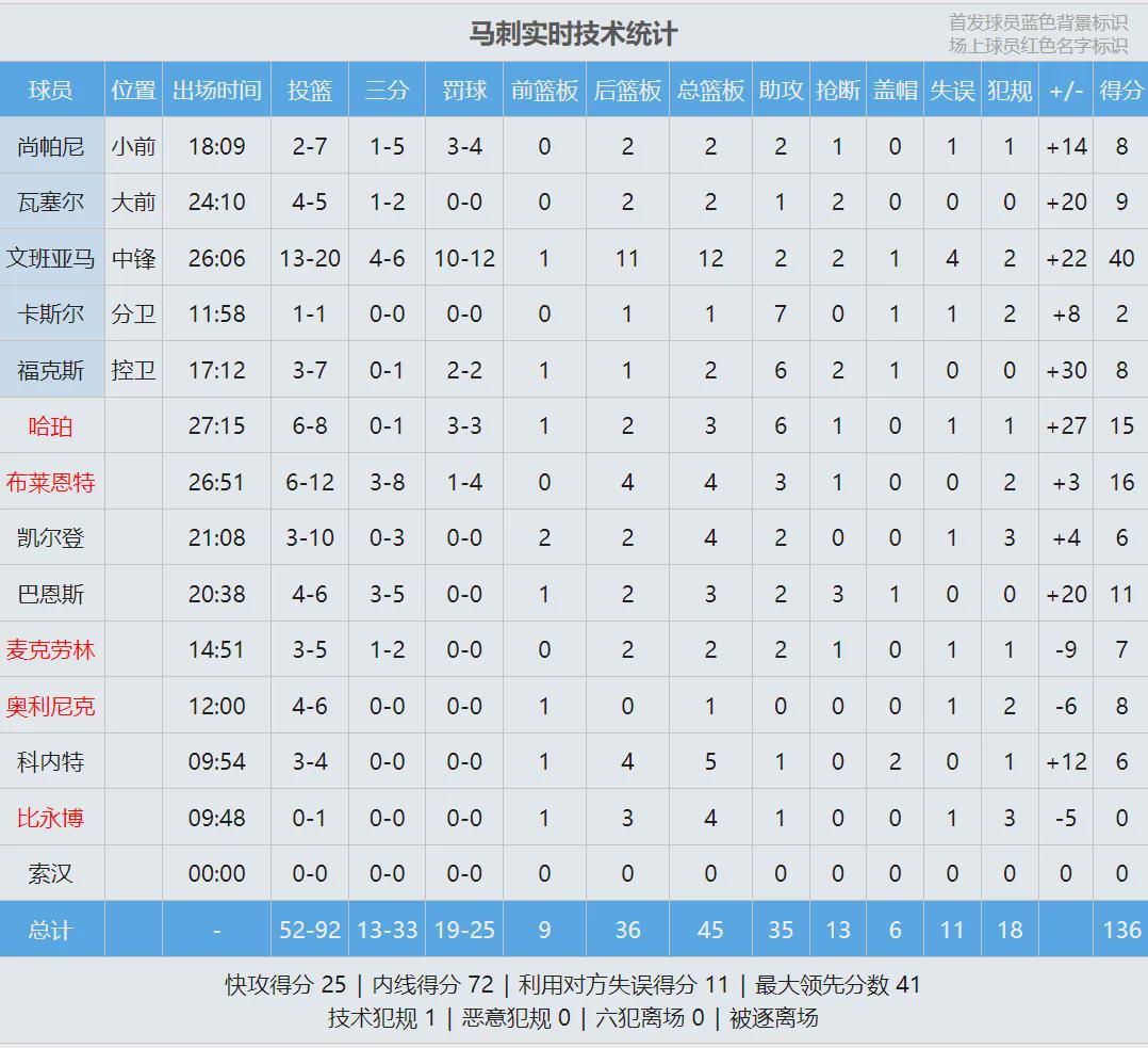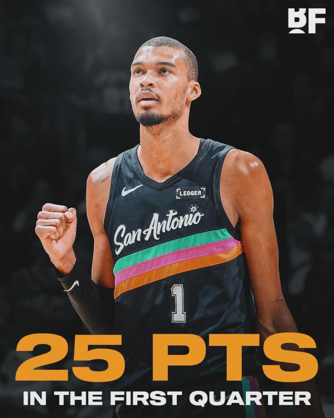 湖人進(jìn)攻還算不錯,首節(jié)得到30分,但馬刺全隊(duì)單節(jié)轟下47分。文班亞馬第一節(jié)只打了8分鐘,9投8中狂轟25分3籃板1搶斷1蓋帽,一個人打爆湖人全隊(duì)。第二節(jié)海斯多次在籃下單挑文班亞馬,一個人連拿7分,隨后湖人連續(xù)失誤。