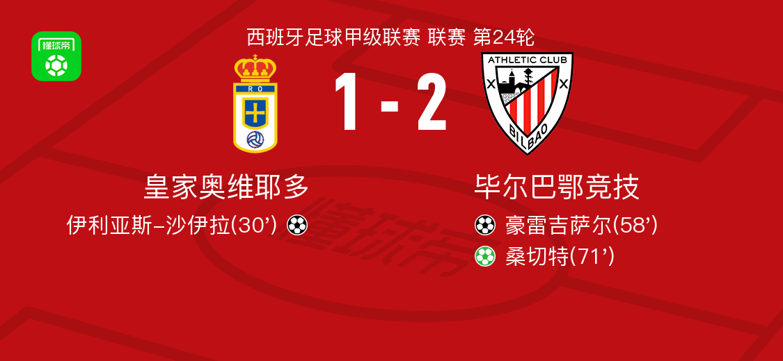 北京時(shí)間2月15日西班牙足球甲級(jí)聯(lián)賽 聯(lián)賽 第24輪,皇家?jiàn)W維耶多主場(chǎng)對(duì)陣畢爾巴鄂競(jìng)技?;始?jiàn)W維耶多伊利亞斯-沙伊拉破門。畢爾巴鄂競(jìng)技豪雷吉薩爾破門,桑切特破門。最終比分皇家?jiàn)W維耶多 1-2 畢爾巴鄂競(jìng)技。