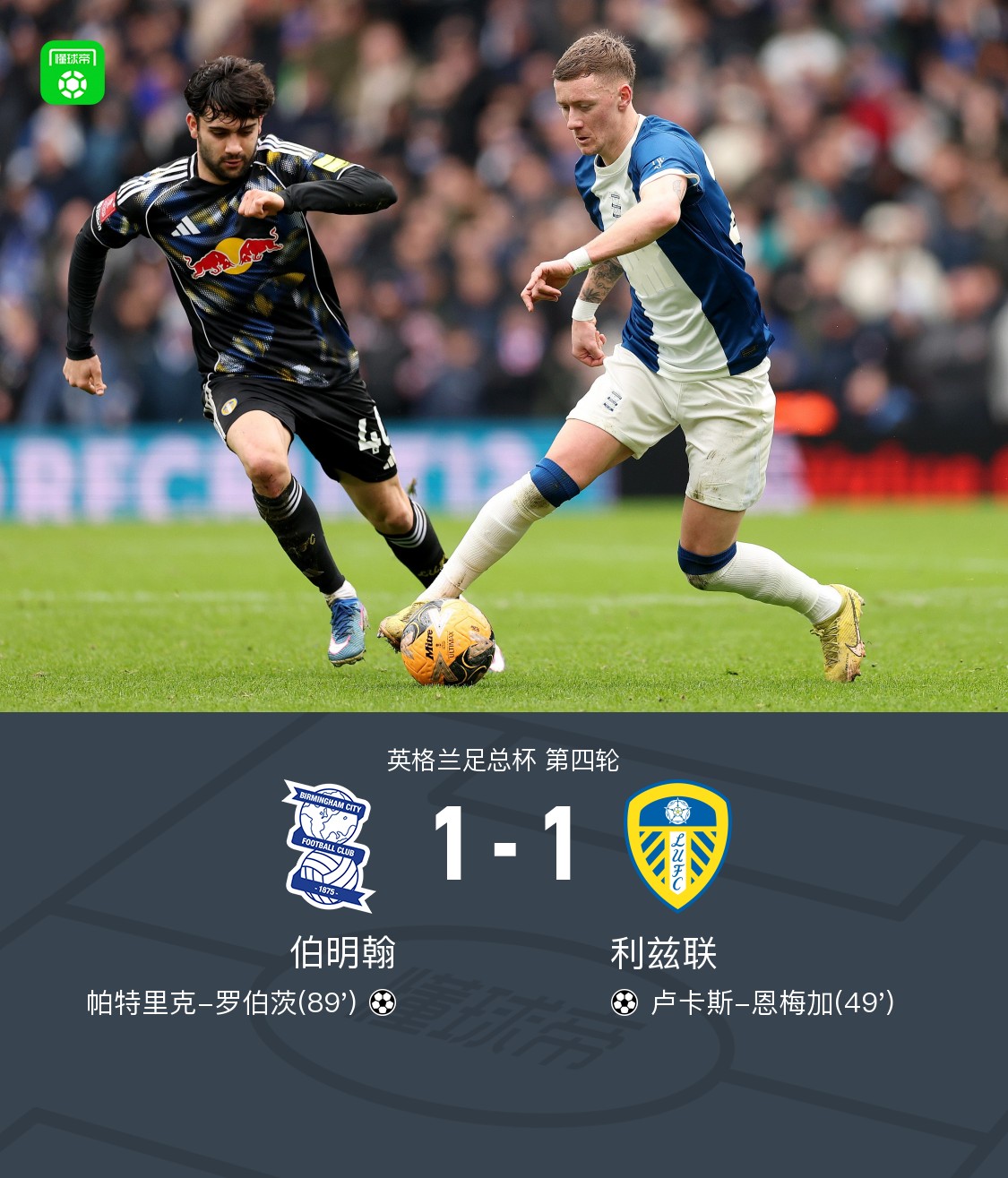 北京時(shí)間2月15日英格蘭足總杯 第四輪,伯明翰對(duì)陣?yán)澛?lián)。伯明翰帕特里克-羅伯茨破門。利茲聯(lián)盧卡斯-恩梅加破門。最終比分伯明翰 1-1 利茲聯(lián)。