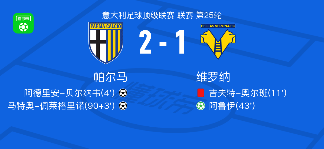 北京時(shí)間2月15日意大利足球頂級(jí)聯(lián)賽第25輪,帕爾馬主場(chǎng)對(duì)陣維羅納。比賽中,帕爾馬球員率先通過配合由阿德里安-貝爾納韋打入一球;隨后維羅納球員吃到紅牌,球隊(duì)陷入被動(dòng);半場(chǎng)結(jié)束前,維羅納依靠點(diǎn)球由阿魯伊扳回一球;下半場(chǎng)補(bǔ)時(shí)階段,帕爾馬再次通過配合由馬特奧-佩萊格里諾破門鎖定勝局。最終比分帕爾馬2-1維羅納。