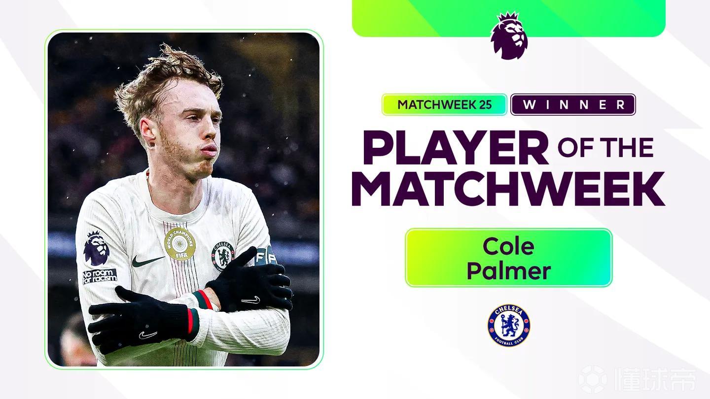 切爾西攻擊手科爾-帕爾默在球隊(duì)3-1客勝狼隊(duì)的比賽中發(fā)揮驚艷,當(dāng)選英超第25輪最佳球員。