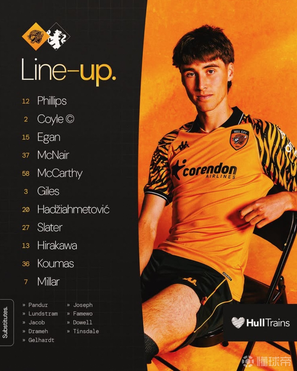 赫爾城首發(fā):12-菲利普斯、37-麥克奈爾、15-伊根、58-麥卡錫、2-科伊爾、27-斯萊特、20-哈吉艾哈邁托維奇、3-賈爾斯、7-米勒、13-平河悠、36-庫馬斯