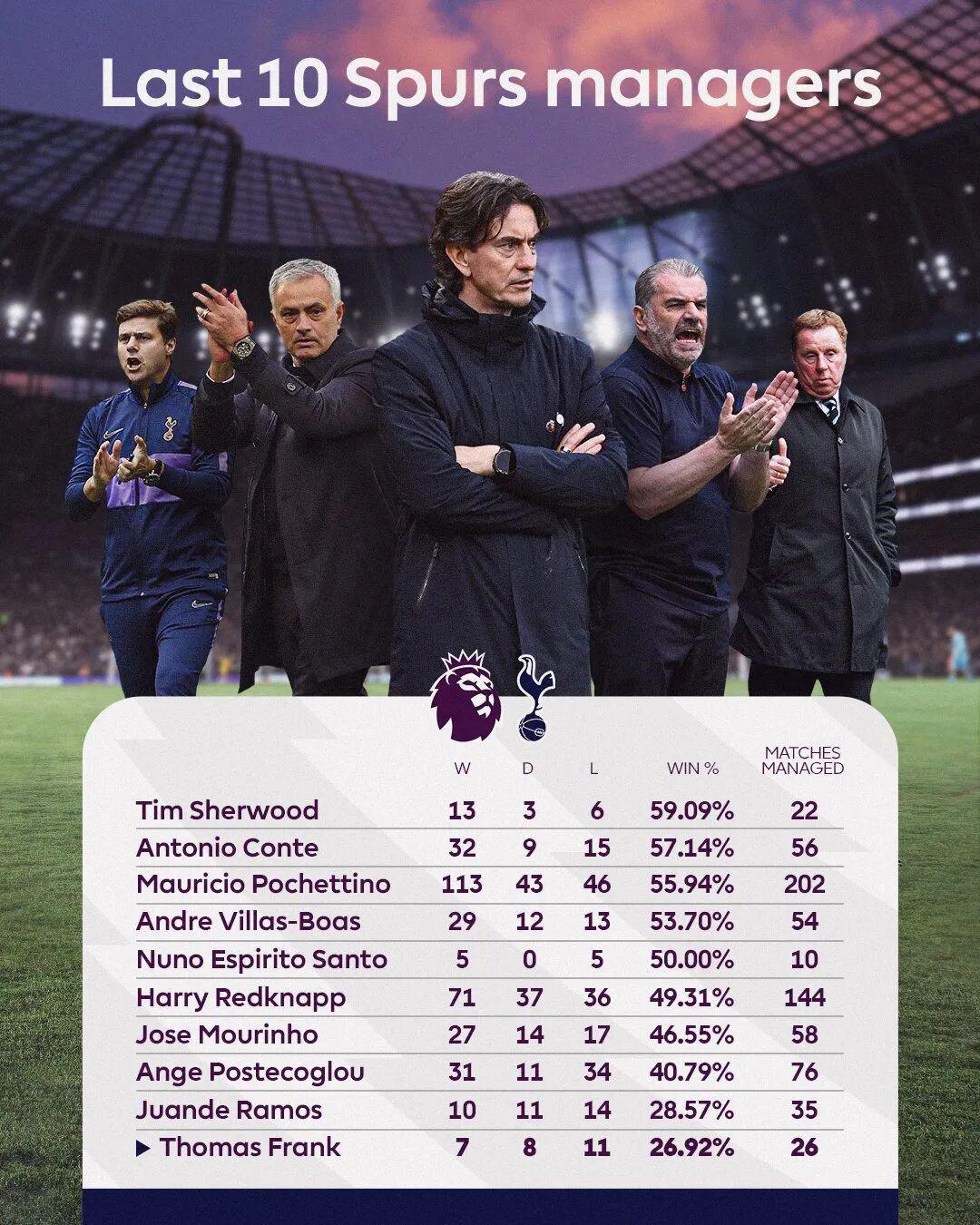 去年夏熱刺支付1000萬鎊解約金,從布倫特福德挖來弗蘭克。正如熱刺換帥公告所言,俱樂部耐心足夠,兩個(gè)半月以來一直力保新帥。但身為傳統(tǒng)六強(qiáng)之一的熱刺,不可能對(duì)持續(xù)的糟糕戰(zhàn)績無動(dòng)于衷。弗蘭克執(zhí)教熱刺26場英超,7勝8平11負(fù)積29分,場均1.12分是隊(duì)史執(zhí)教5場及以上教練有記錄以來最低。此時(shí)不炒,更待何時(shí)?
