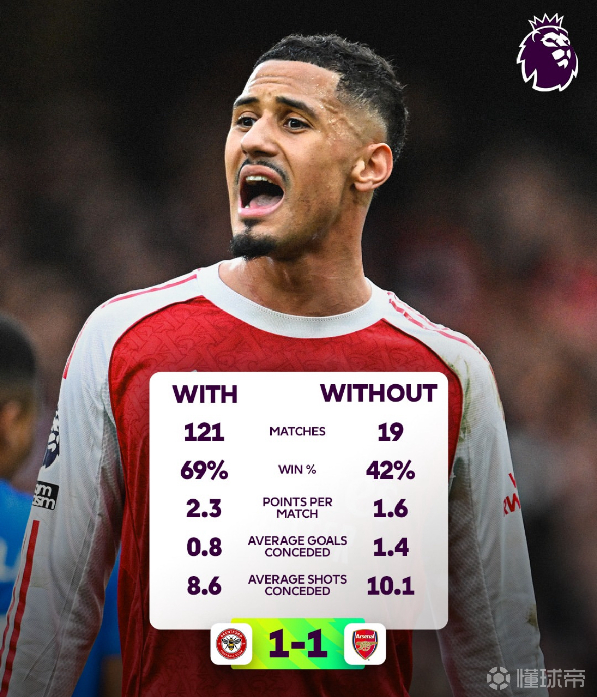 薩利巴對(duì)阿森納的重要性:在有薩利巴的英超比賽中,阿森納的勝率是69%,薩利巴不在的時(shí)候下降到了42%!