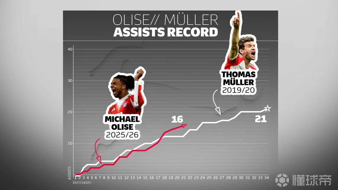 凱恩本賽季至今已打入24球。那個(gè)令人難忘的2020/21賽季,萊萬(wàn)在德甲第21輪戰(zhàn)罷時(shí)已打入25球,僅比如今的凱恩多1球。奧利塞本賽季助攻數(shù)已達(dá)16次。托馬斯?穆勒在2019/20賽季創(chuàng)下的單賽季21次助攻的德甲紀(jì)錄,如今已岌岌可危。最后,截至第21輪,拜仁已轟入79球,場(chǎng)均進(jìn)球數(shù)高達(dá)3.76粒,這一數(shù)據(jù)也創(chuàng)下了德甲聯(lián)賽同期進(jìn)球數(shù)的歷史新高。德甲單賽季進(jìn)球紀(jì)錄同樣由拜仁保持,1971/72賽季拜仁共打入101球,如今拜仁只需在剩余13輪再進(jìn)23球就能刷新這一紀(jì)錄,以當(dāng)前的進(jìn)攻狀態(tài),這一目標(biāo)似乎唾手可得。