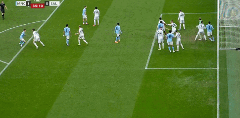 第36分鐘,曼城角球開出,斯通斯前插搶點倒地